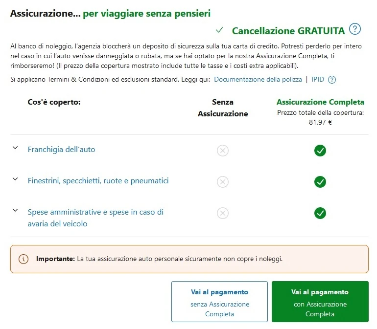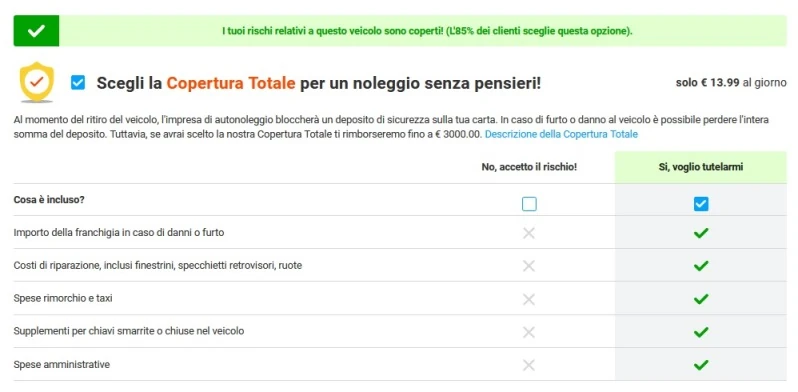 Se selezioni un’offerta ti vengono nuovamente elencate tutte le condizioni di noleggio, e ti viene proposta un’assicurazione integrativa: