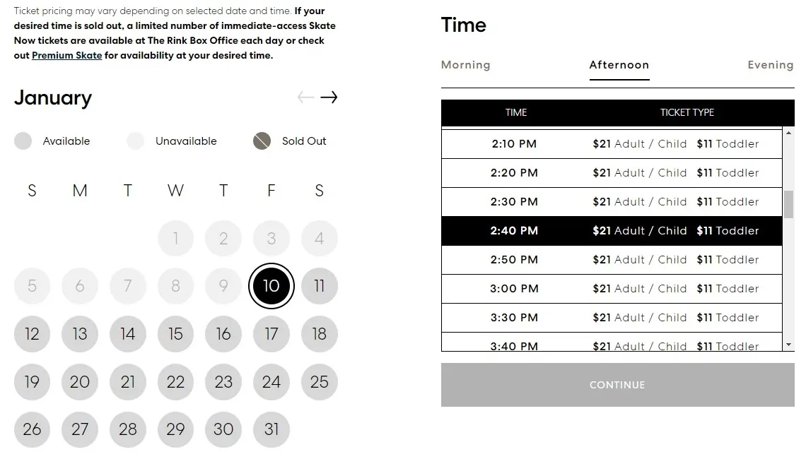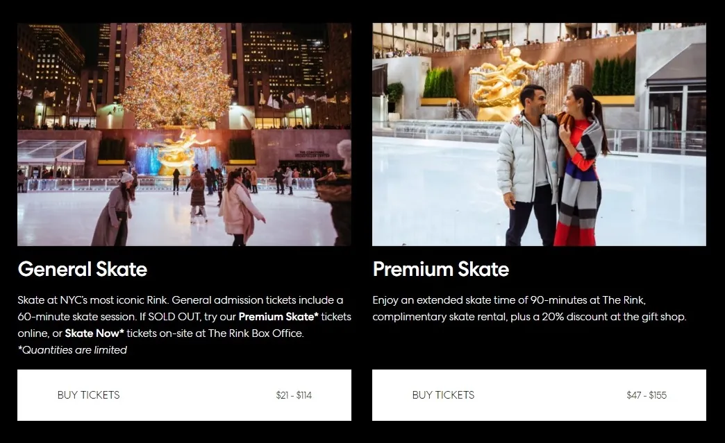 Essendo il posto più ambito però i prezzi negli ultimi anni sono aumentati parecchio: per la normale sessione da 60 minuti (General Skate) si va da un minimo di 21$ ad un massimo di 114$ a persona, che diventano 47-115$ a persona per la sessione Premium Skate da 90 minuti (in cui però è compreso il noleggio dei pattini).