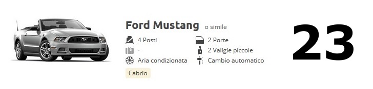 - La Mustang cabrio consuma poco di più di una berlina normale e assicura il massimo del divertimento (ovviamente costa parecchio di più come rata giornaliera di noleggio, tanto che il consumo di benzina è secondario).